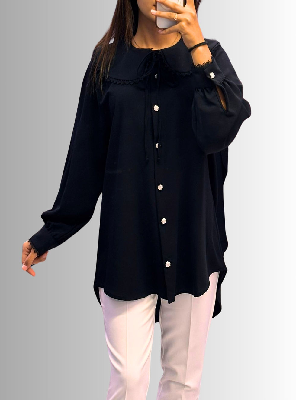 🌸Bebe Yaka Taşlı Düğmeli, Yaka Ve Kol Ucu Dantel Detaylı Rahat Kalıp Gömlek